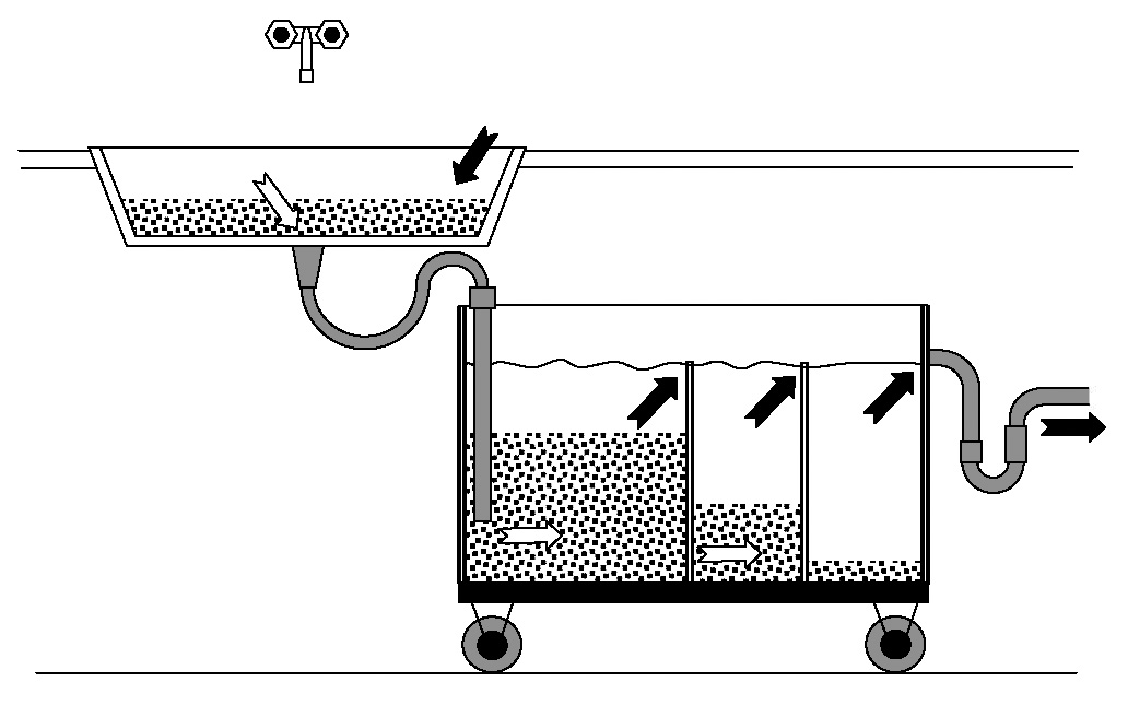 Odkaľovacia nádrž je vybavená 4-mi navádzacími kolieskami a môže byť pripevnená na každej odpadové potrubie. Inštaluje sa medzi umývadlo a odpadovú rúrku. Nečistoty prúdi do prvej komory a usadzujú sa na dne prvé komory. Keď je prvá komora plná, čiastočne odkaleny odpad prúdi cez deliacú stenu do druhej komory a potom do tretej. V každej komore zostáva usadenina na dne a až odpadová voda dobre zbavená nečistôt z hliny odchádza do kanalizačného potrubia. Nádrž by mala byť čistená od naneseného kalu, raz za čas, alebo podľa potreby.